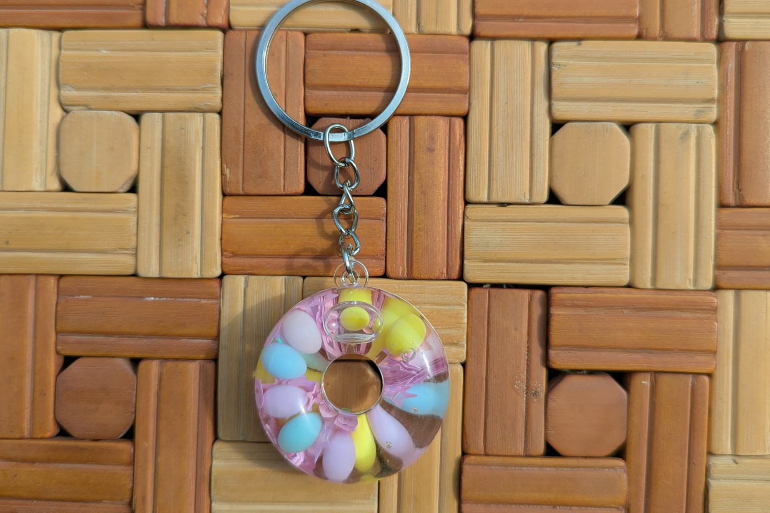This donut-shaped resin keychain features pastel colors and a glossy finish—perfect for keys, backpacks, purses, and gifting.